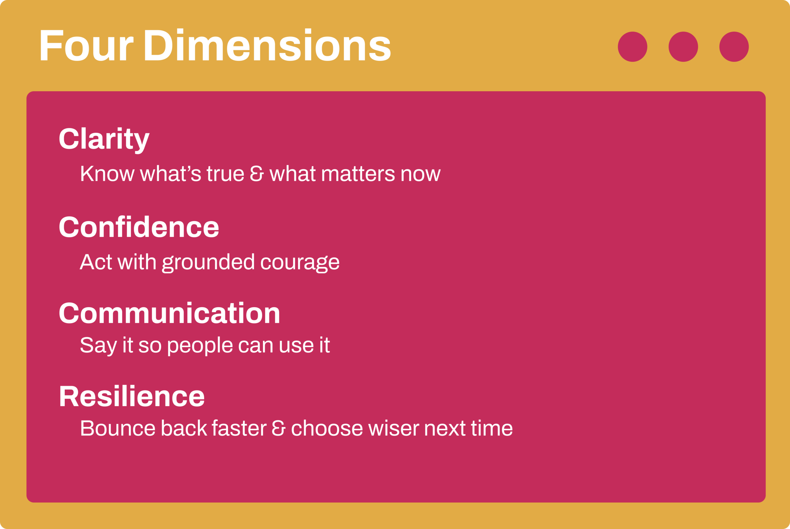 We turn big feelings and messy moments into simple, repeatable behaviors anyone can do under pressure. Built on the four dimensions we strengthen again and again: Clarity, Confidence, Communication, Resilience.